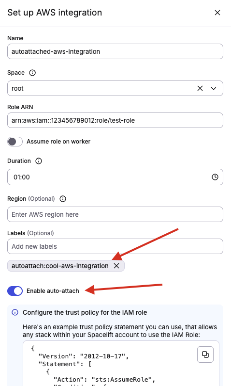 AWS integrations can now be auto-attached to stacks and modules. To do so, include a label in your integration following this format autoattach:<your_label>. Then select the Enable auto-attach toggle and click Set up.