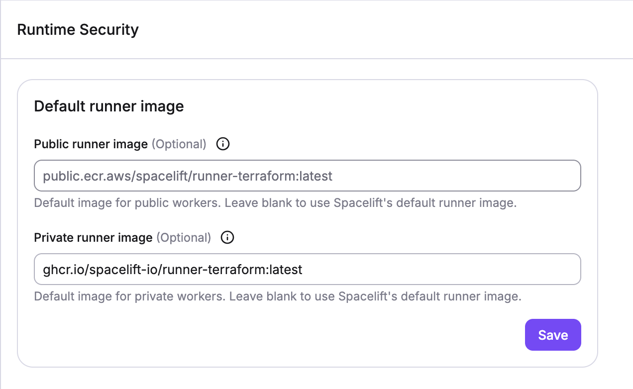 You can set default runner images at the account level. This option can be found in the Organization Settings → Runtime Security section. These defaults will be used for all stacks in the account that do not have a specific runner image set. You can set different defaults for stacks running on public and private worker pools.