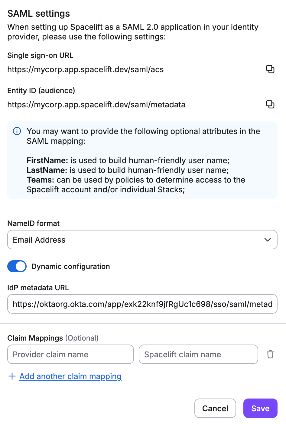 https://<account>.app.spacelift.io/saml/metadata). - Name ID format: EmailAddress is a good default. Transient and Persistent are also supported.