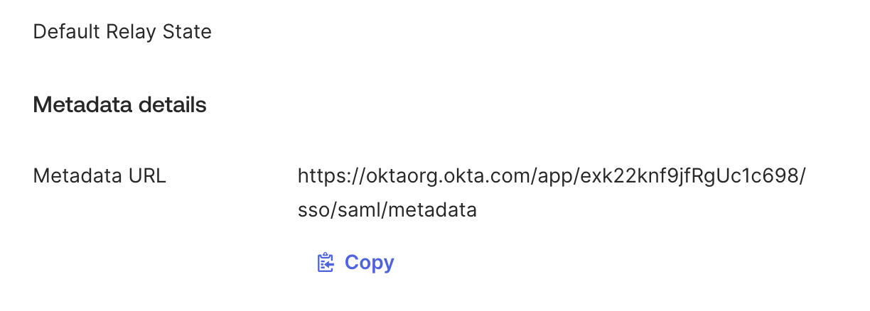 After completing the Okta wizard, you'll be presented with the app's Metadata URL. It looks something like https://<org>.okta.com/app/<app-id>/sso/saml/metadata.