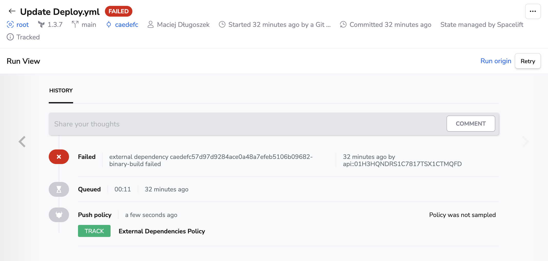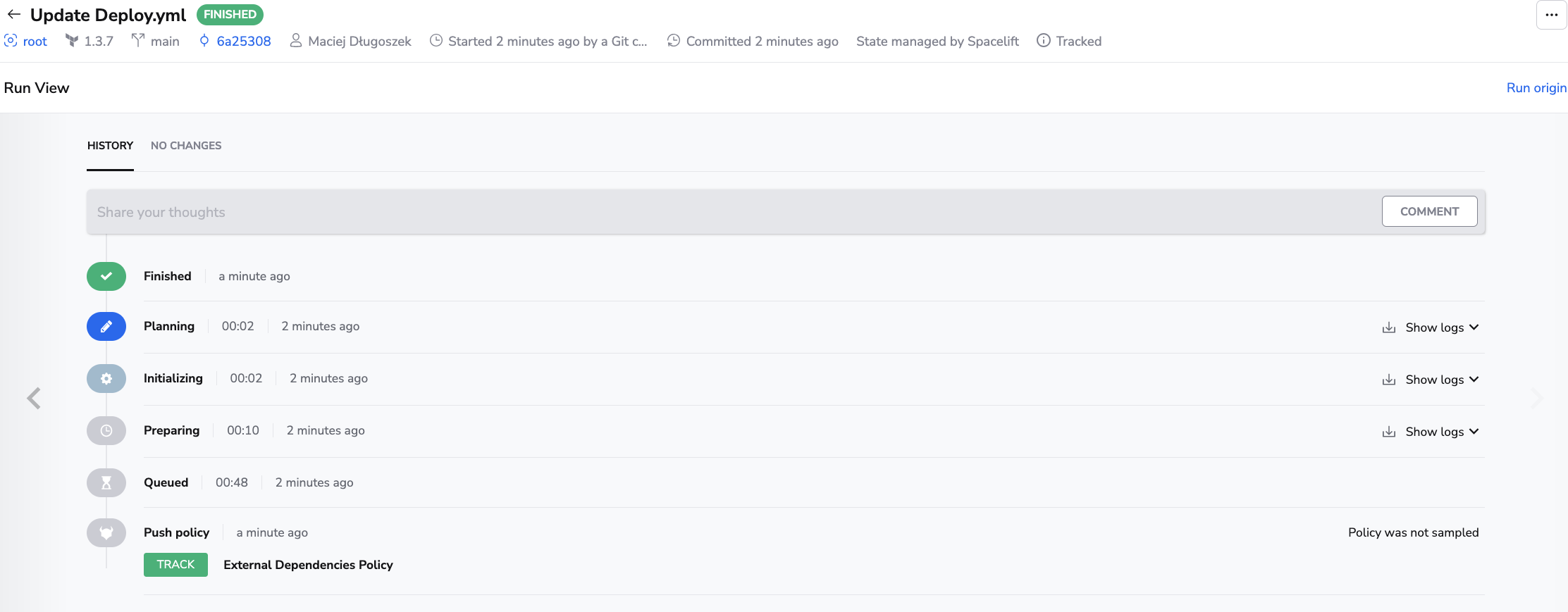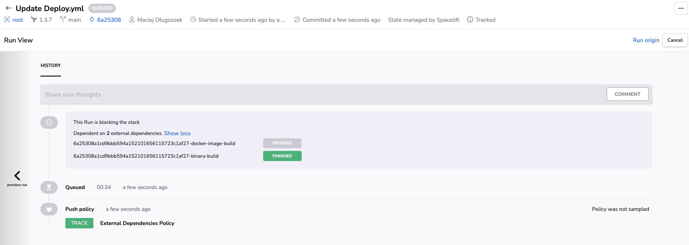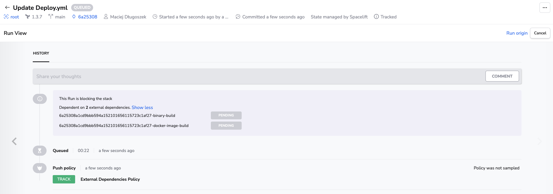 Having the policy and the pipeline defined, we can now test it. Creating a new commit in the repository will trigger the pipeline. As we can see a run was created in Spacelift, but it's in queued state. The run will not start until all the dependencies are marked as finished.