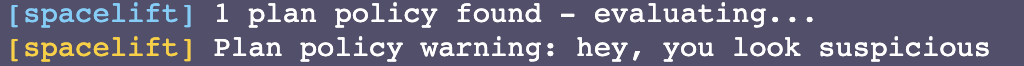 Plan policies are the only ones that have access to the actual changes to the managed resources, so this is probably the best place to enforce organizational rules and best practices as well as do automated code review. There are two types of rules here that Spacelift will care about: deny and warn. Each of them must come with an appropriate message that will be shown in the logs. Any deny rules will print in red and will automatically fail the run, while warn rules will print in yellow and will at most mark the run for human review if the change affects the tracked branch and the Stack is set to autodeploy.