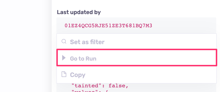 More importantly, though, you can drill down to see the runs that either created, or last updated each of the managed resources. Let's now go back to our stripe_price, and click on the ID of the run shown in the Last updated by section. You will notice a little menu pop up: