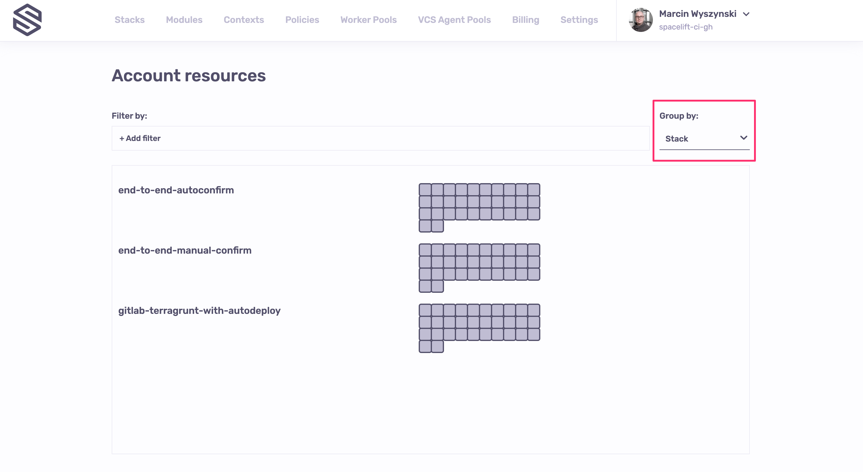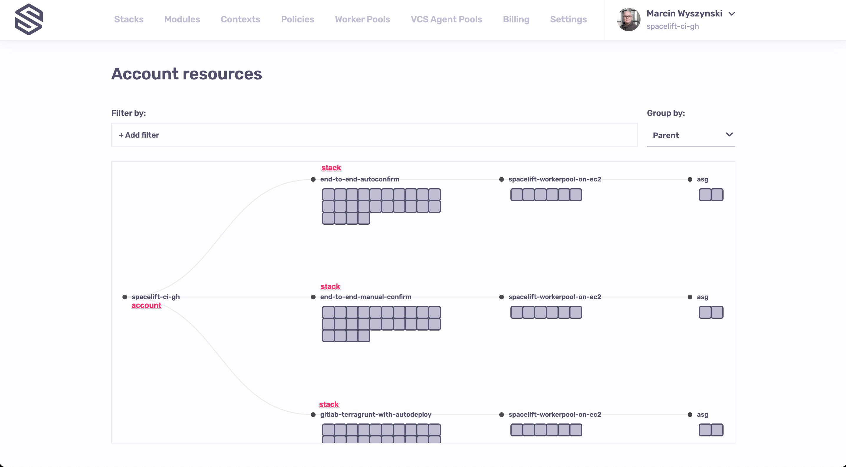 By default we group by parent, giving you the same hierarchical view as for stack-level resources. But you will notice that there's a new common account root serving as a "virtual" parent for stacks.