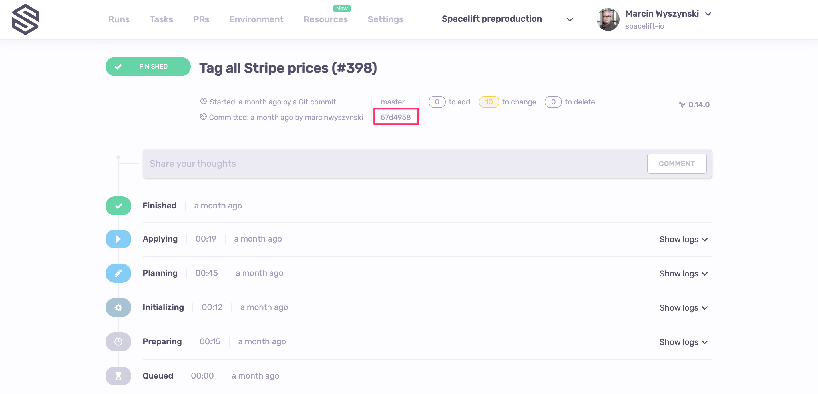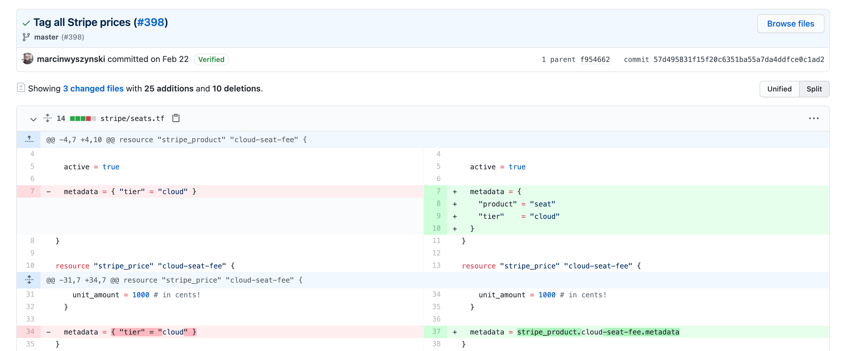 One extra click on the commit SHA will take you to the GitHub commit. Depending on your Git flow, the commit may be linked to a Pull Request, giving you the ultimate visibility into the infrastructure change management process: