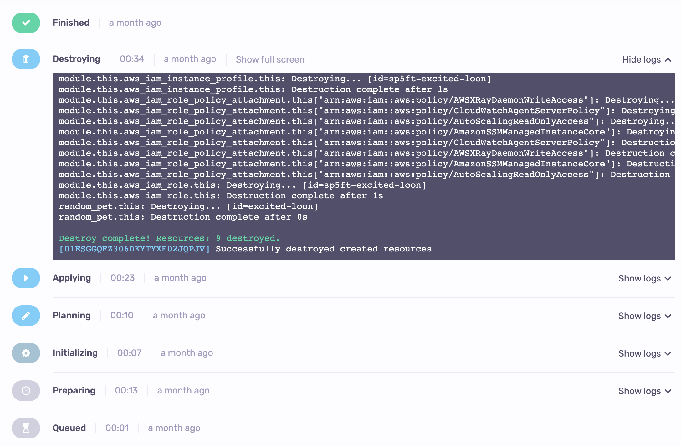 In a nutshell, module test cases are almost identical to autodeployed tracked runs. But unlike stacks, modules are stateless and do not manage any resources directly, so just after the changes are applied and resources are created, they are immediately destroyed during the destroying phase. Here is what a fully successful module test case looks like:
