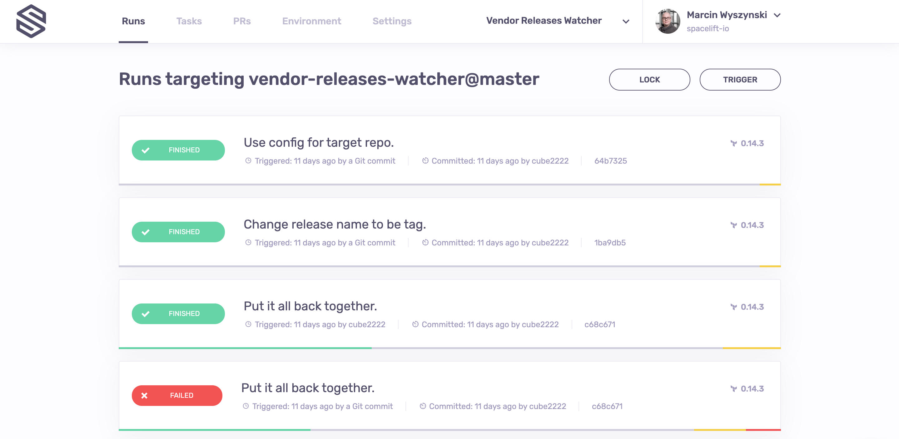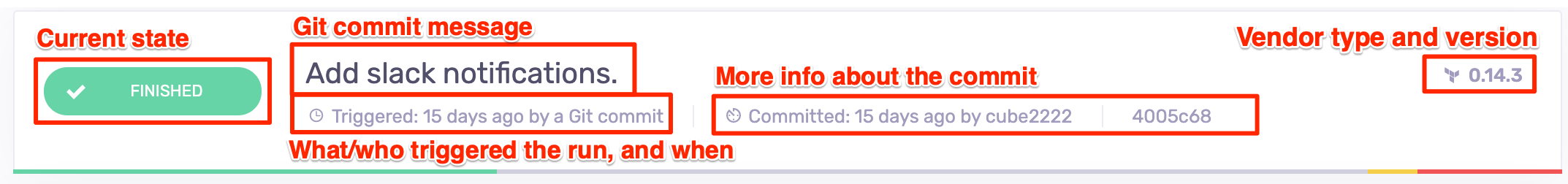 Also worth noting is the colorful strip present on some runs - as long as the planning phase was successful this visually represents the resources and outputs diff introduced by the change: