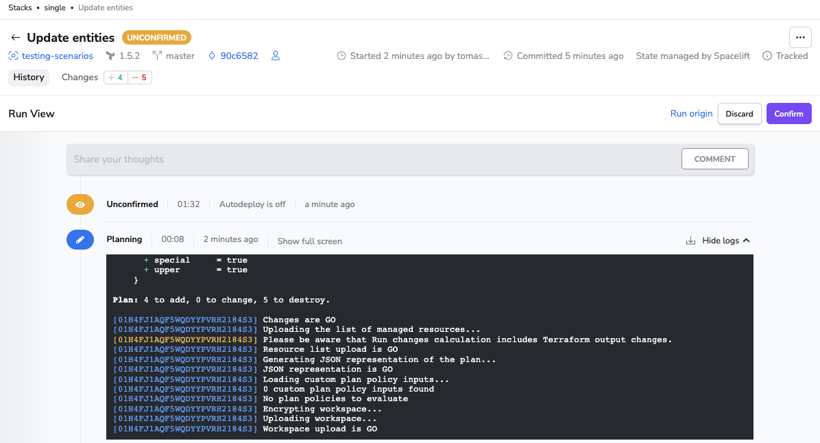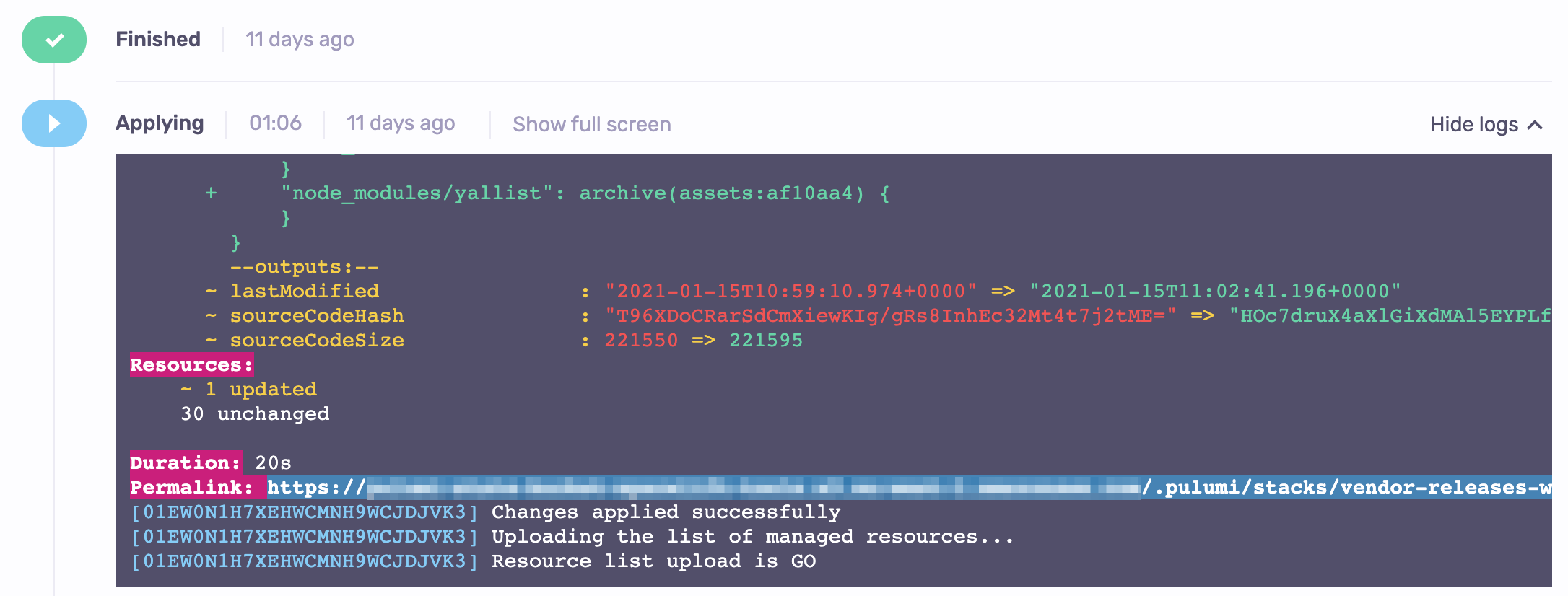 This preparation phase is very unlikely to fail, but if it does (eg. the worker node becomes unavailable during the transition), the run will transition to the terminal failed state. If the handover succeeds, or the run does not go through the manual approval process, the applying phase begins and attempts to deploy the changes. Here's an example: