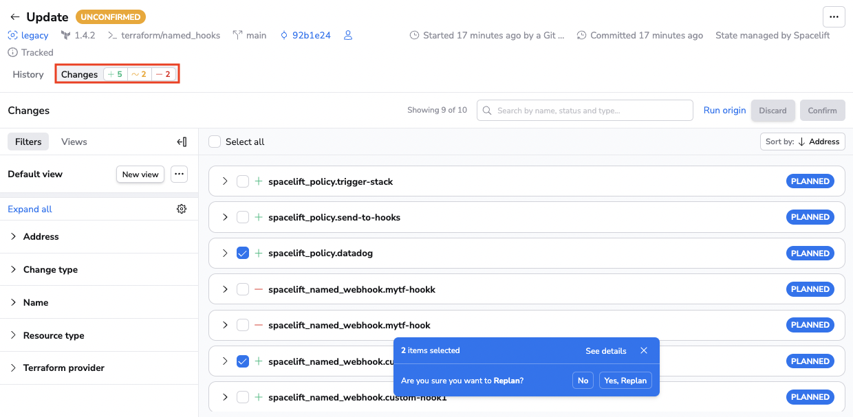When a run is in the Unconfirmed state it's also possible to replan it. When replanning, a user is able to generate a new plan to apply by only picking specific changes from the current plan. This is working similarly to how passing the -target option to a terraform plan command does, without giving you the headache of writing the name of each resource you want to add to your targeted run.