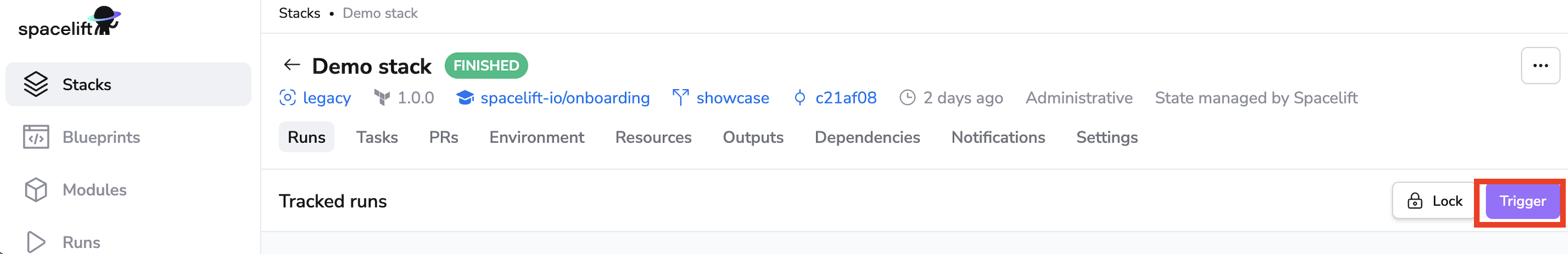 Any account admin or stack writer can trigger a tracked run on a stack: