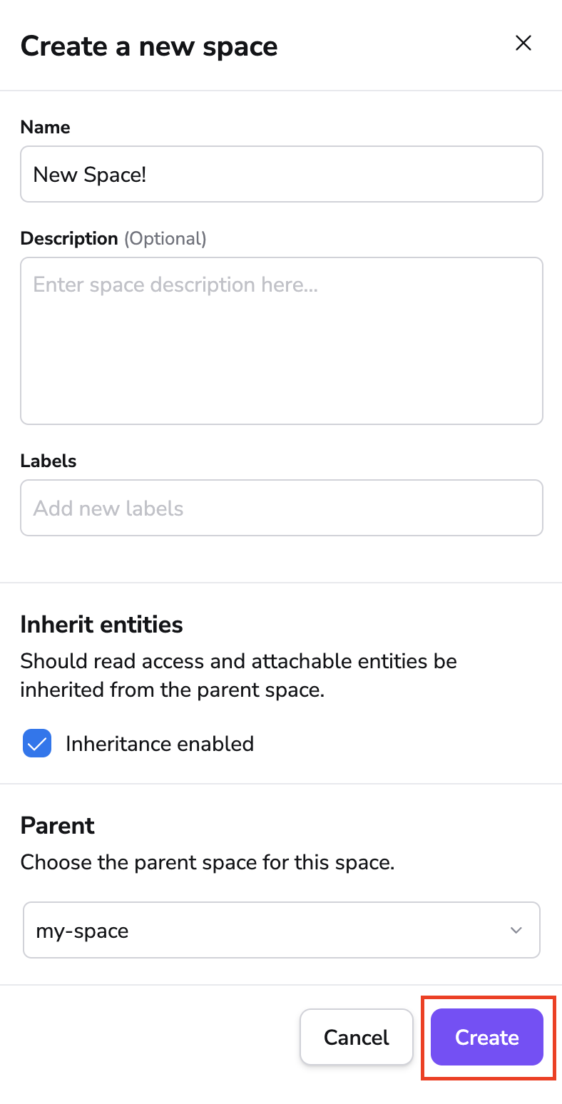 Clicking either will open a modal where you can enter the name of the space, its parent and optionally a description and labels.