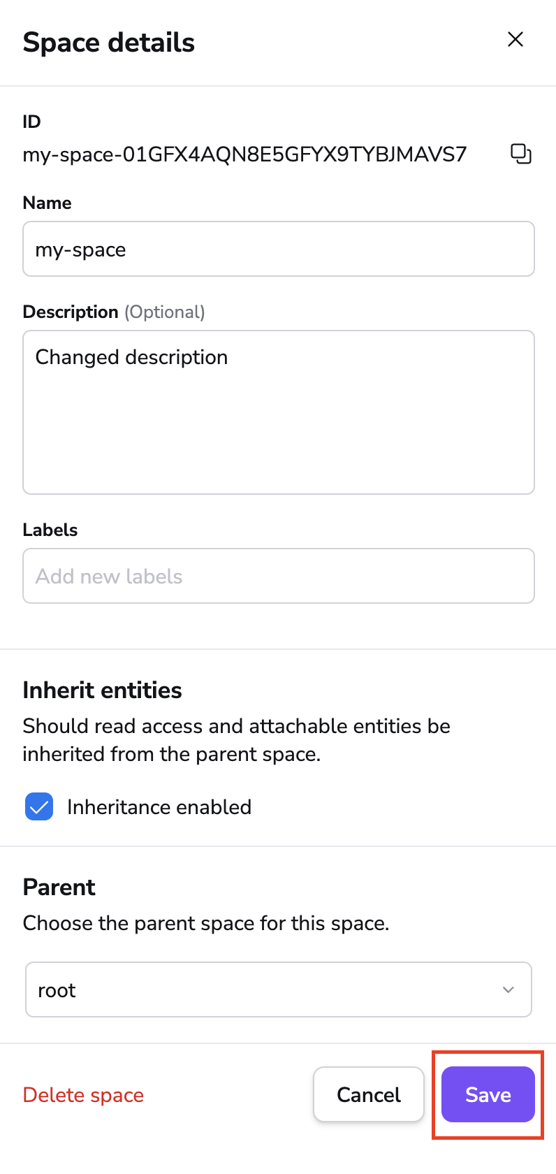 An admin of the root space has the ability to modify spaces. This can be done by clicking on a space card, which opens up a form similar to the one used for creating a space. After performing any changes you can click Save to save them.