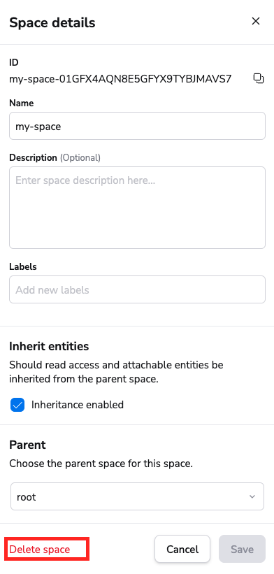 Click on the Delete space button to delete a space: