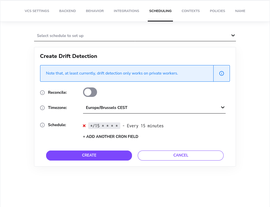 To get started, create a drift detection configuration from the Scheduling section of your stack settings. You will be able to add multiple cron rules to define when your reconciliation jobs should be scheduled, as well as decide whether you want your jobs to trigger tracked runs (reconciliation jobs) in response to detected drift: