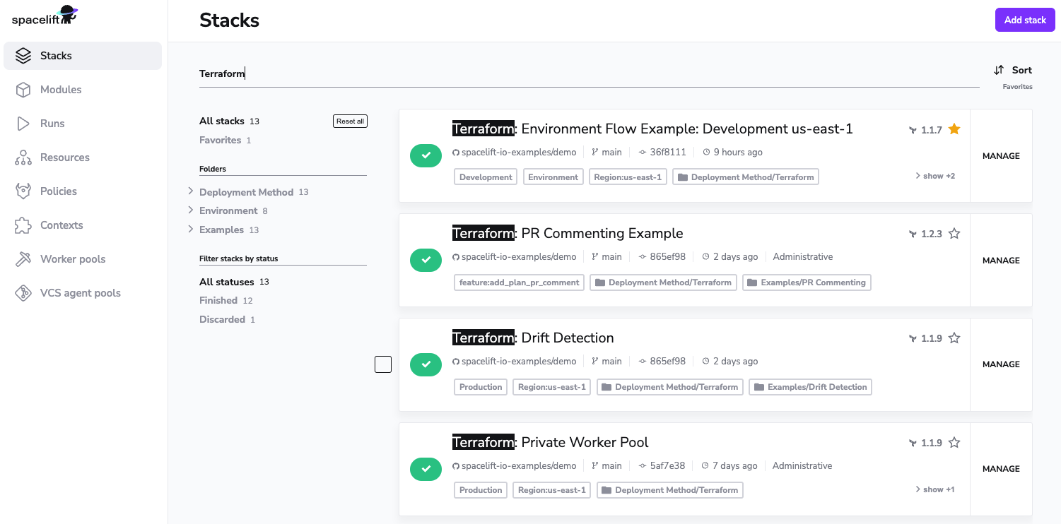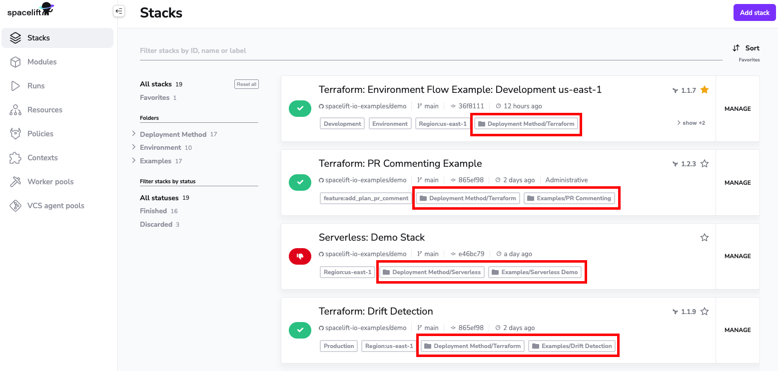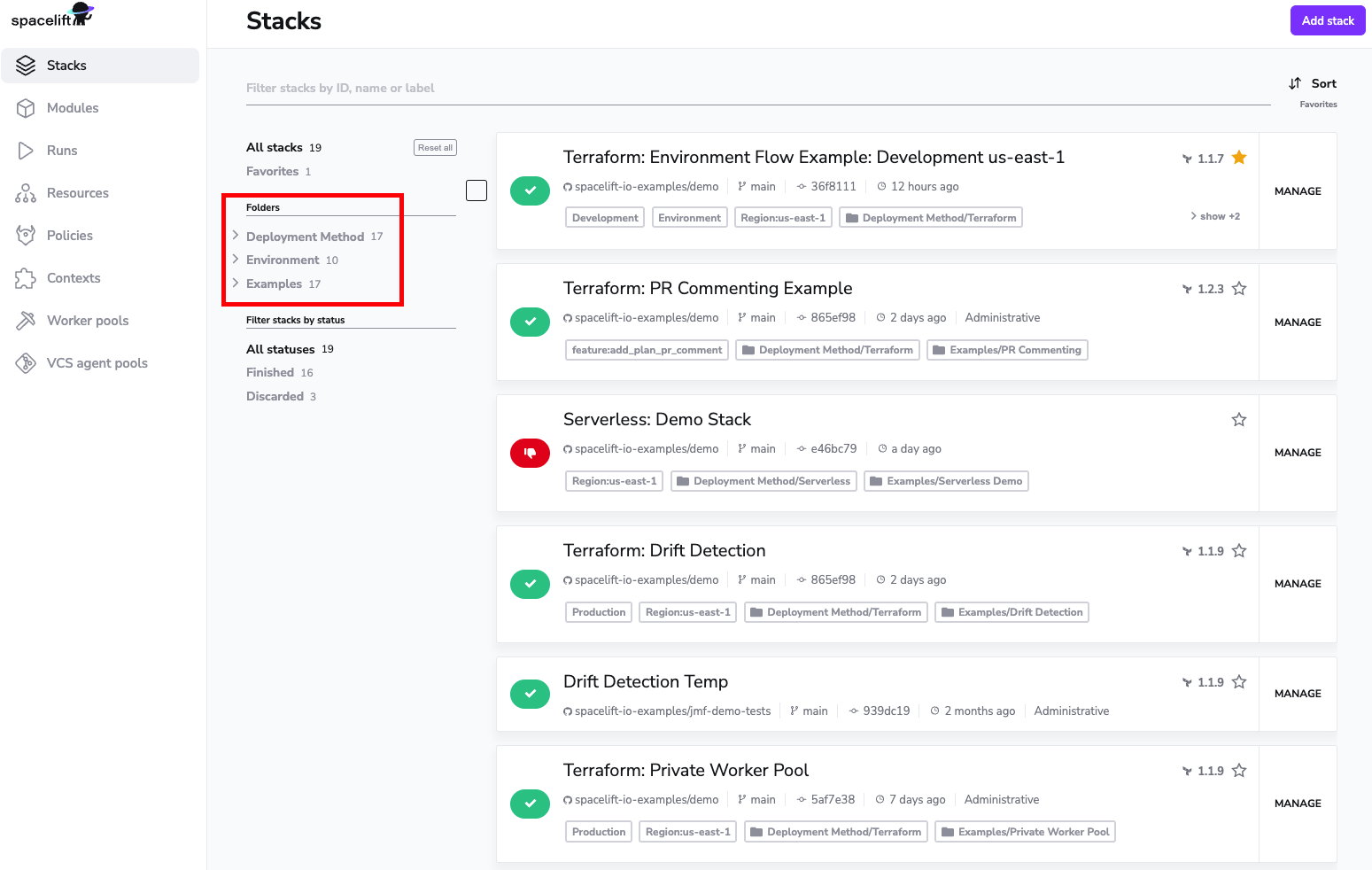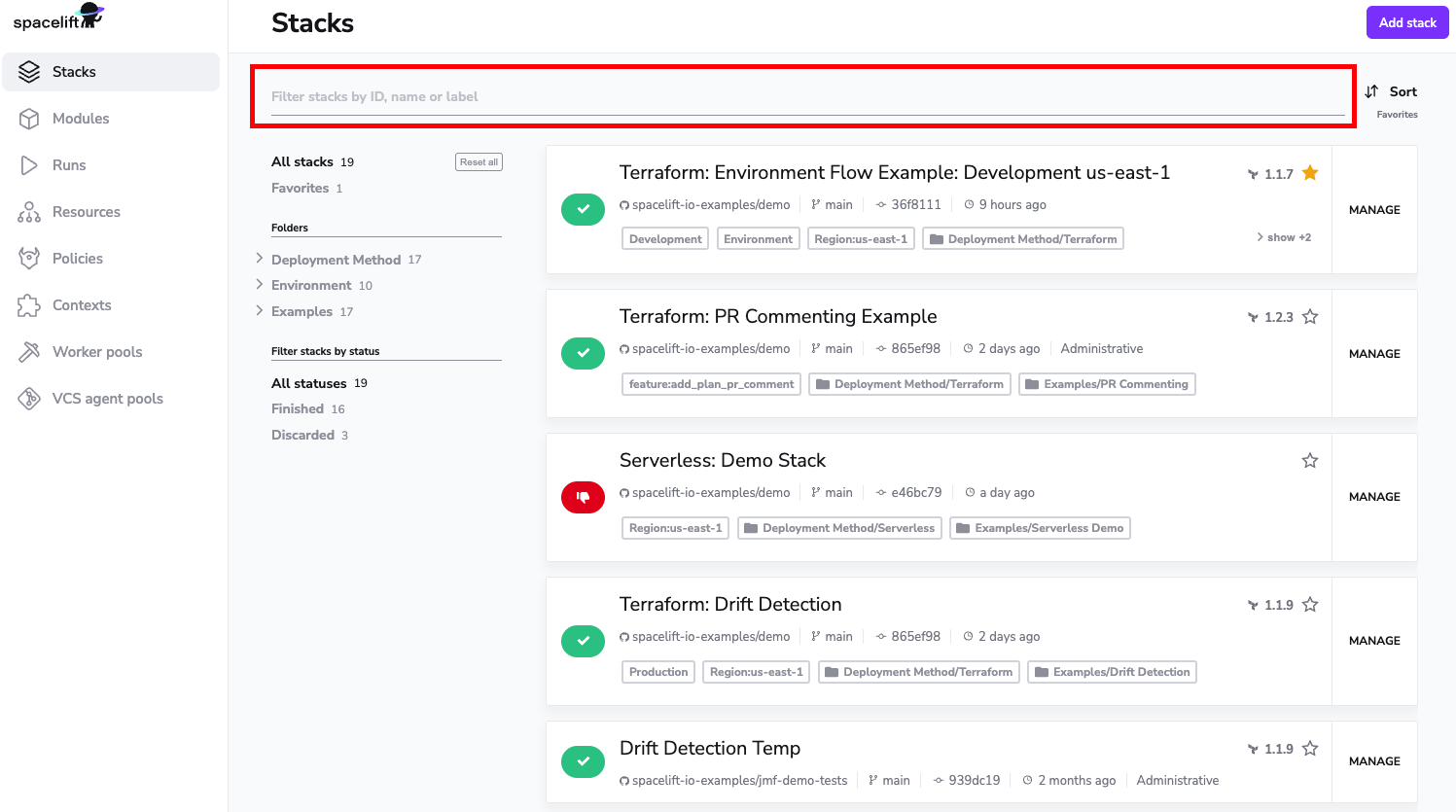 Depending on the complexity of your infrastructure, the size of your team, your particular needs and your preferred way of working you may end up managing a lot of stacks. This obviously makes it harder to quickly find what you're looking for. As practitioners ourselves, we're providing you a few tools to make this process more manageable - from the basic query-based searching to filtering by status and the coolest of all, label-based folders.