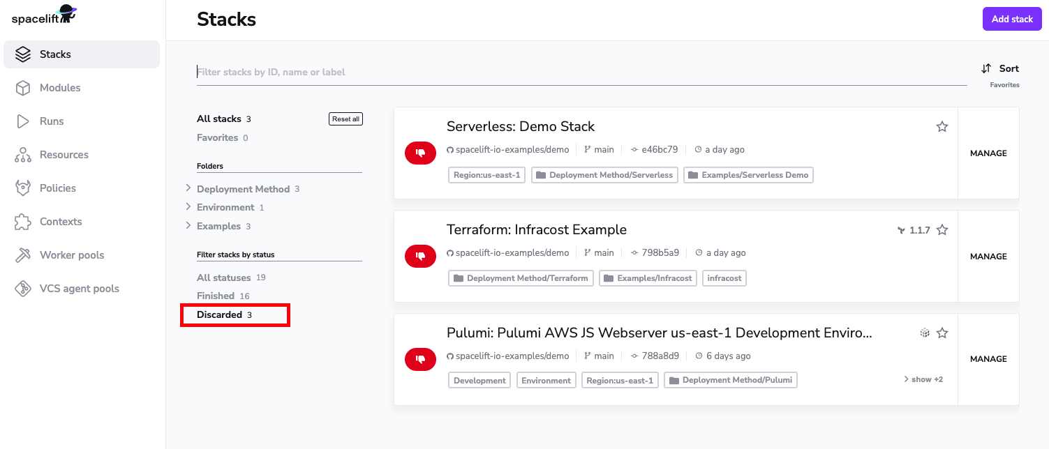 Filtering stacks by status is a very useful mechanism for identifying action items like plans pending confirmation (unconfirmed state) or failed jobs that require fixing. For that, use the Filter stacks by status section on the sidebar to the left. If you click on any of the statuses, the list of stacks will be filtered to only include stacks with a given status: