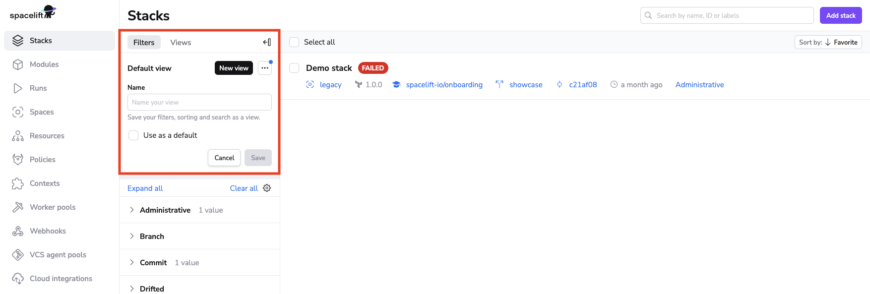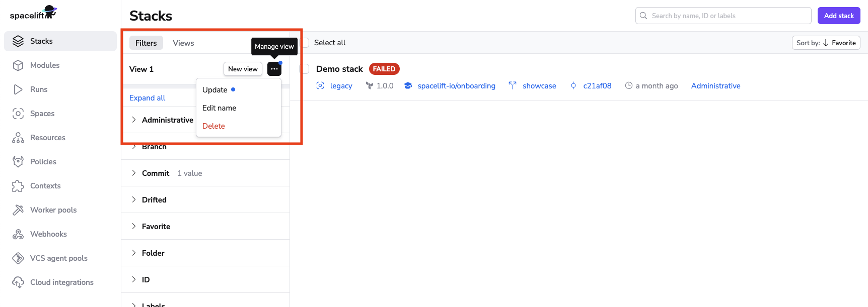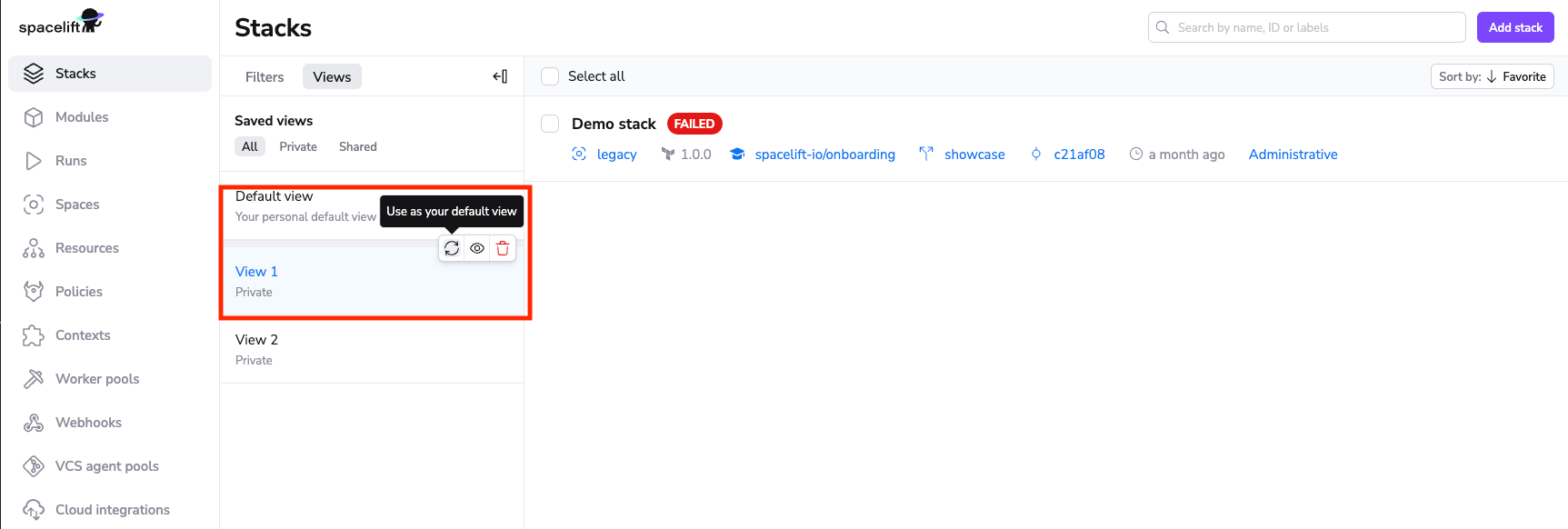 - Delete allows removing your private view (Shared and Spacelift default views can not be removed). You can delete the view from the Views tab as well.