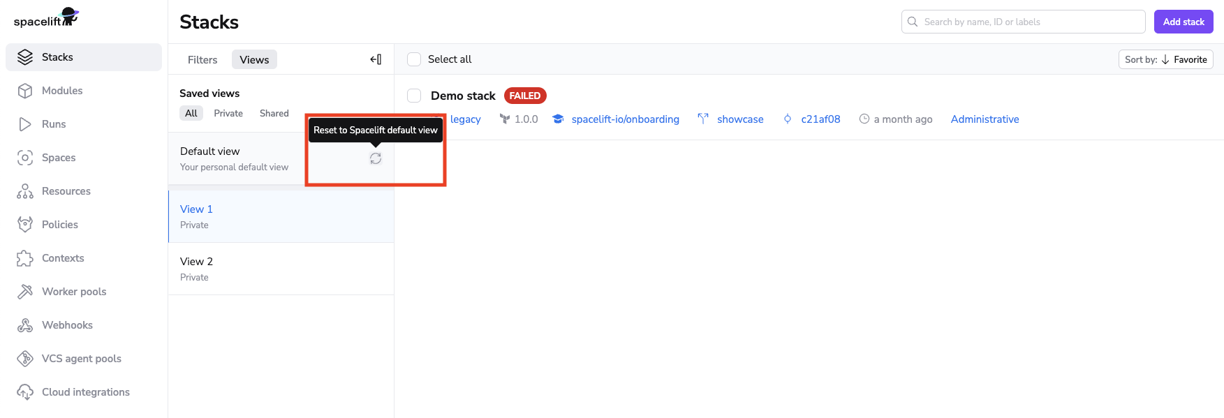 To quickly reset your default view to Spacelift default state, click the "Reset to Spacelift default view" button. It will result in clearing all sorting, search, and filter parameters, as well as managed filter settings.