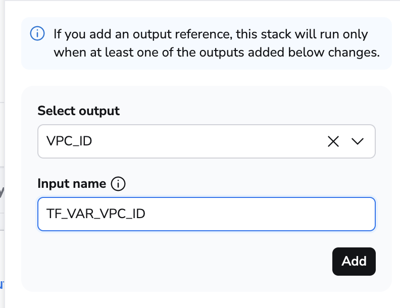 If there is one or more references defined, the stack will only be triggered if the referenced output has been created or changed. If they remain the same, the downstream stack will be skipped.