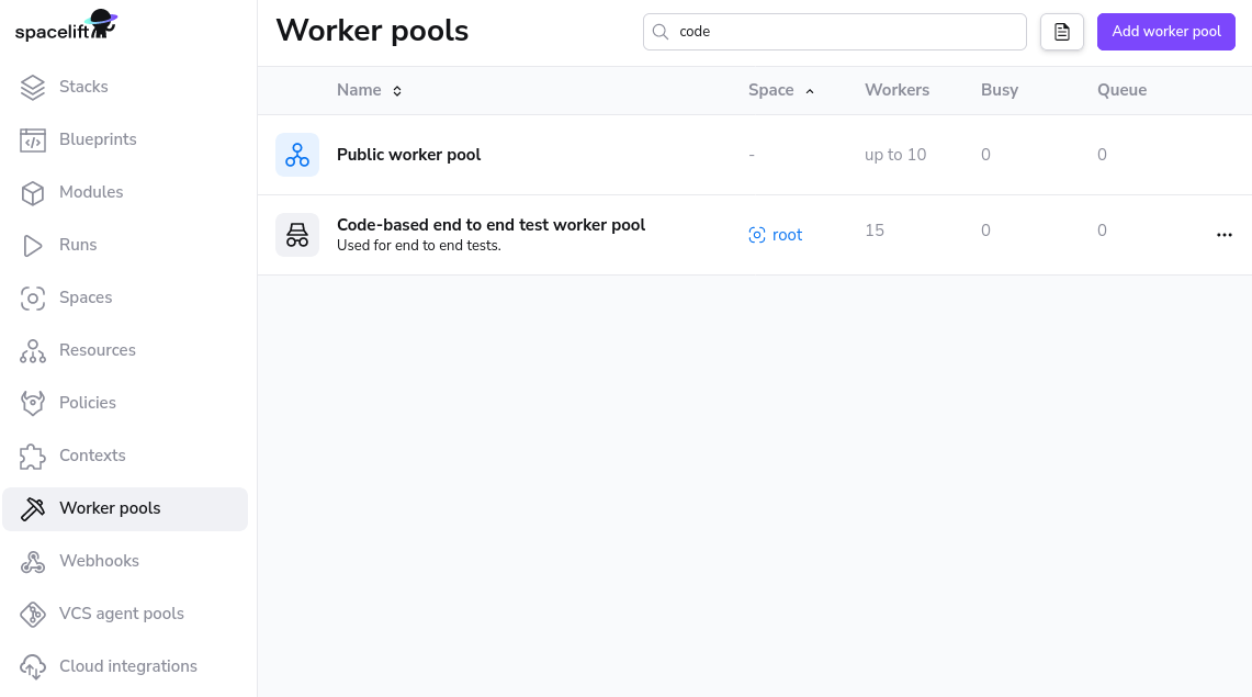 You can set up your worker pool from the Spacelift UI by navigating to Worker Pools section of your account, or you can also create it programmatically using the spacelift_worker_pool resource type within the Spacelift Terraform provider.
