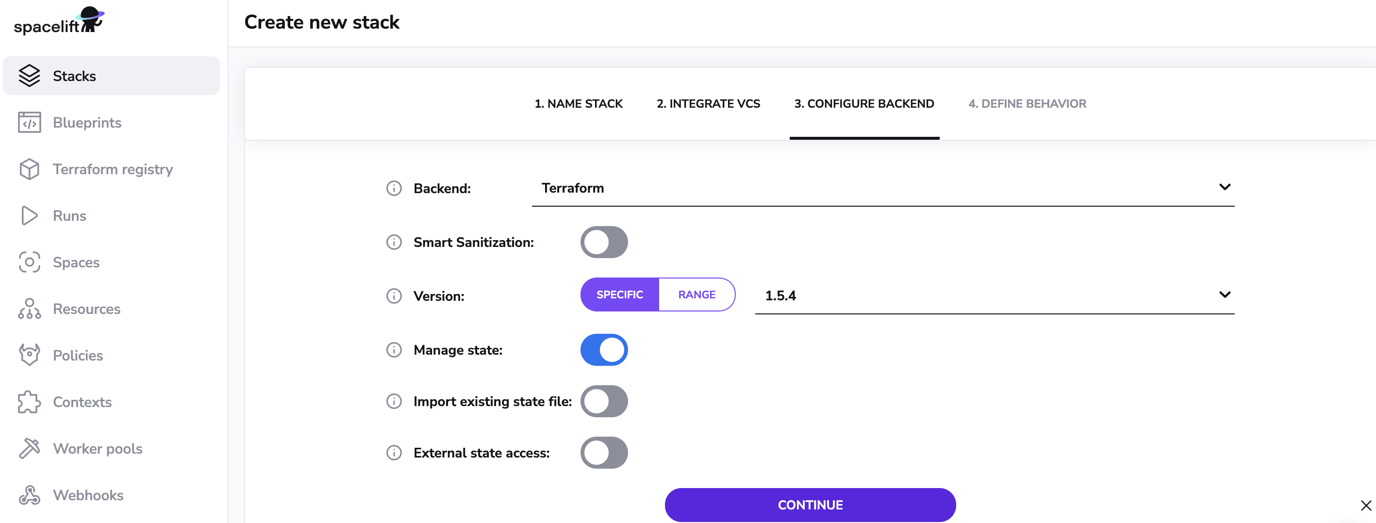 Choose Terraform as your backend with a supported version. Leave the default option to let Spacelift manage state for this stack. Please refer to the creating a stack section of the documentation for information on using a different backend.