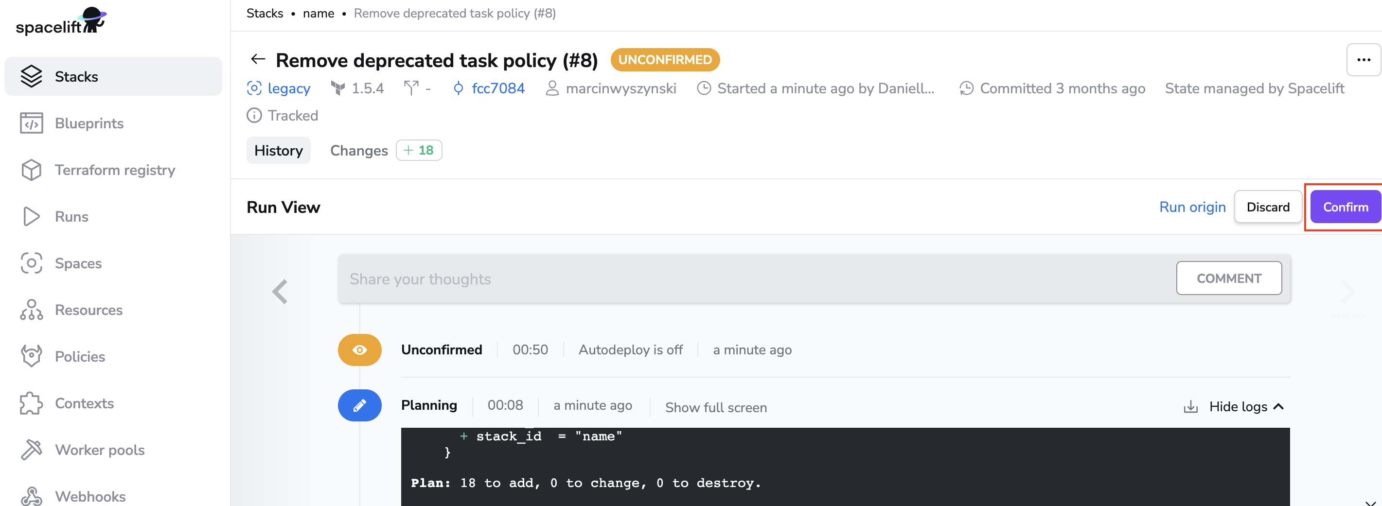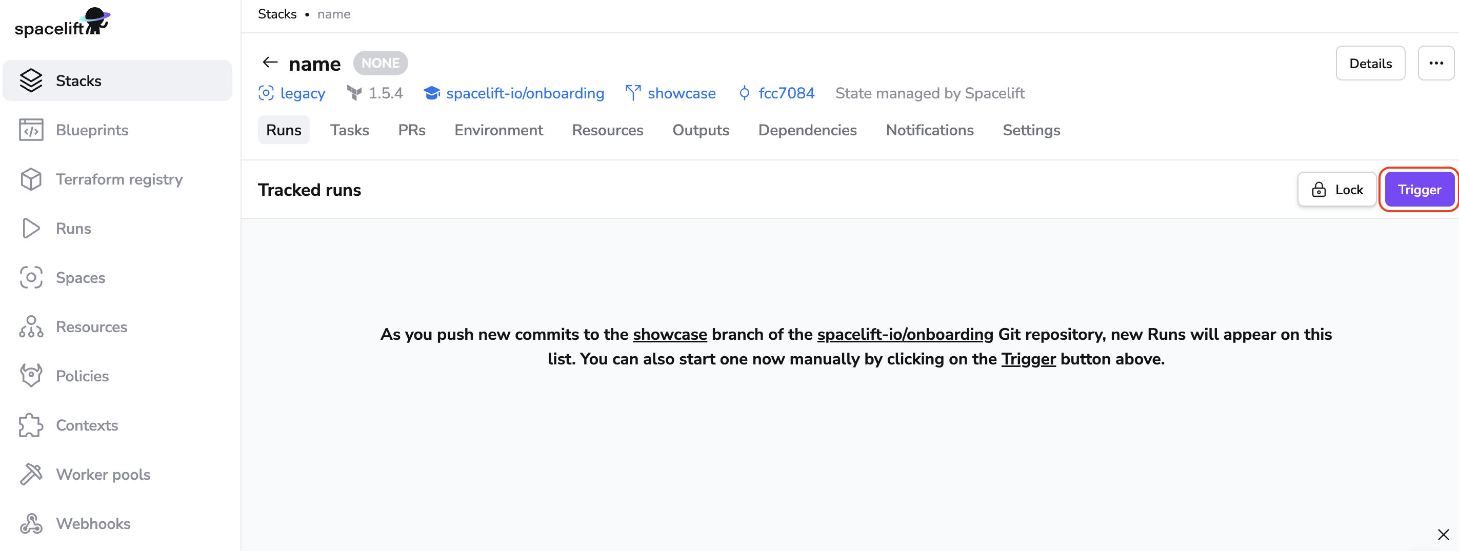 Click on Trigger to kick start a Spacelift run that will check out the source code, run terraform commands on it and then present you with an option to apply (confirm) these changes.