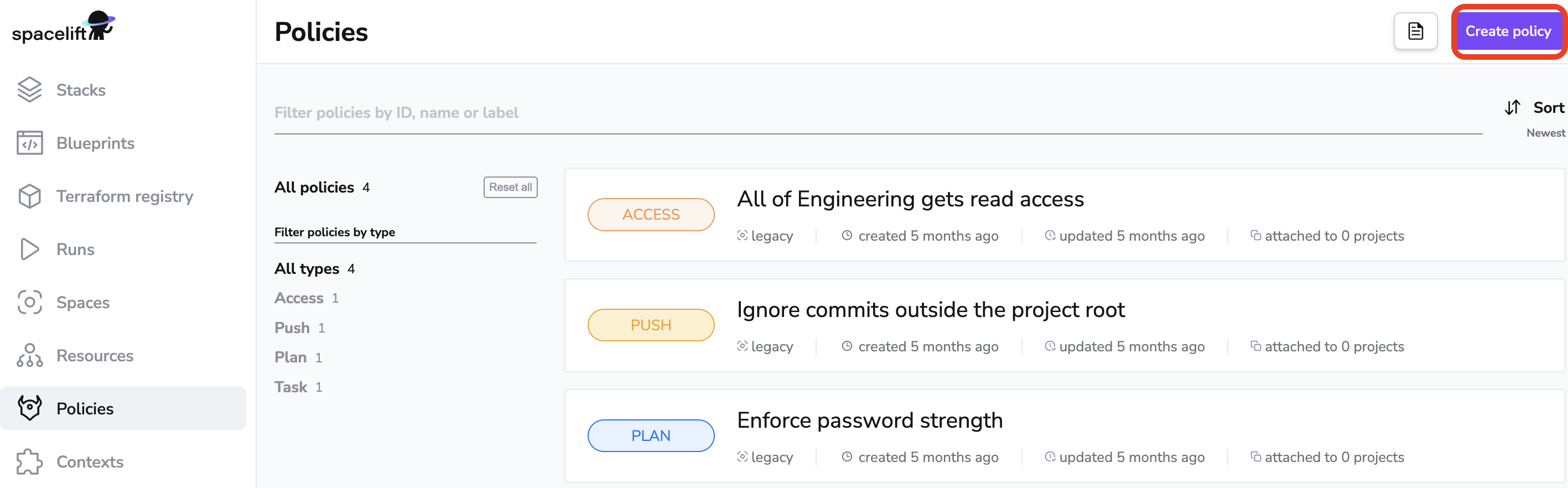 Go to the "Policies" page that can be found on the left sidebar and click the "Create policy" button in the top-right corner.