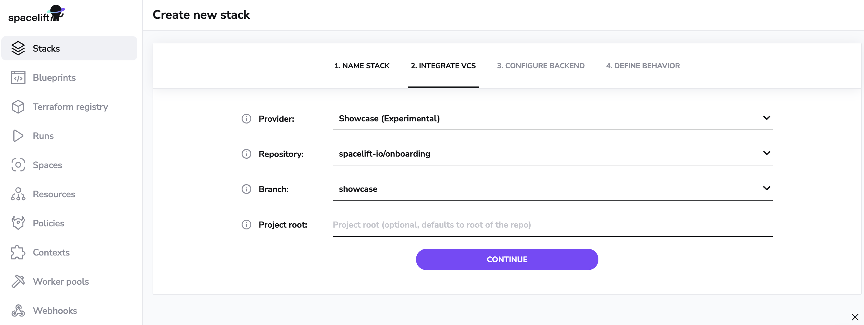In the Integrate VCS tab, choose your VCS provider, select the repository that you gave access to Spacelift in the first step and select a branch that you want to be attached with your Stack. You also have the optional choice of selecting a project root.