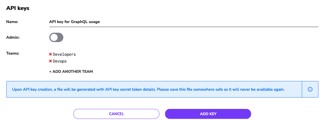 Without further ado, let's create a non-administrative API key with virtual membership in two teams: Developers and DevOps:
