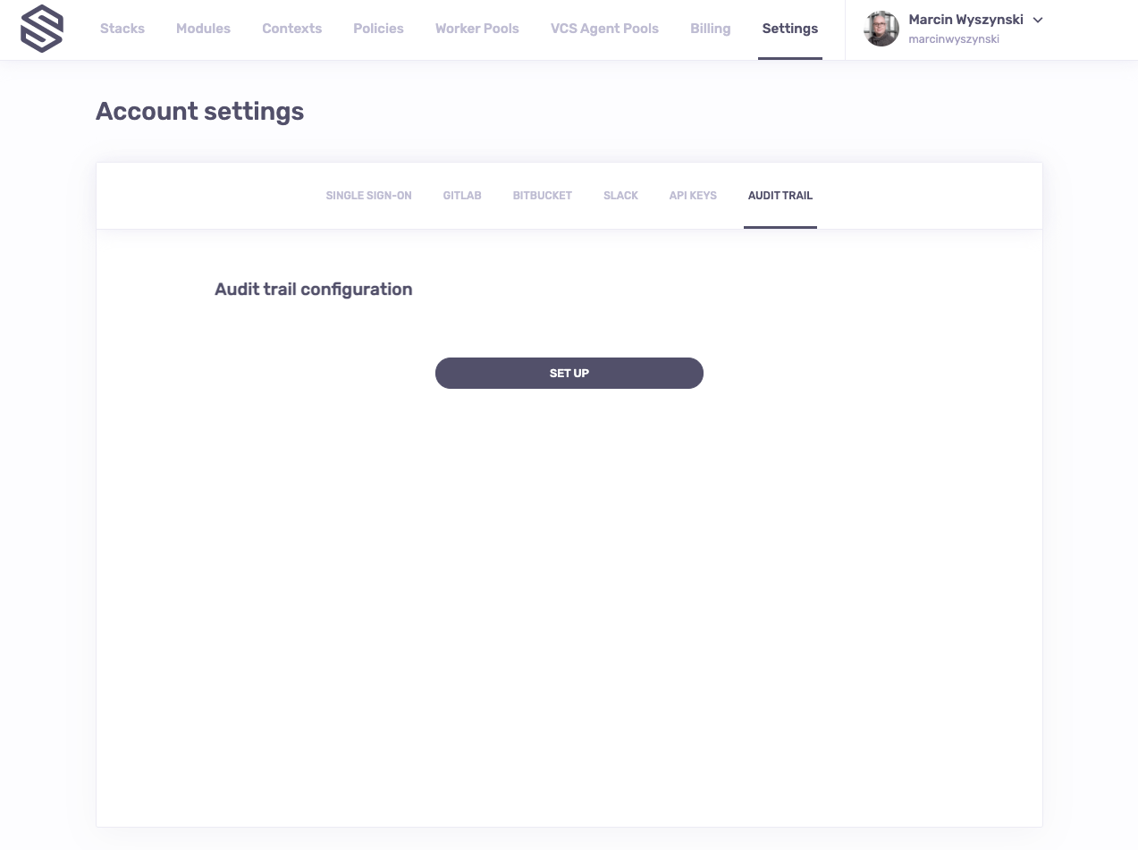 In order to set up the audit trail, navigate to the Audit trail section of your account settings and click the Set up button: