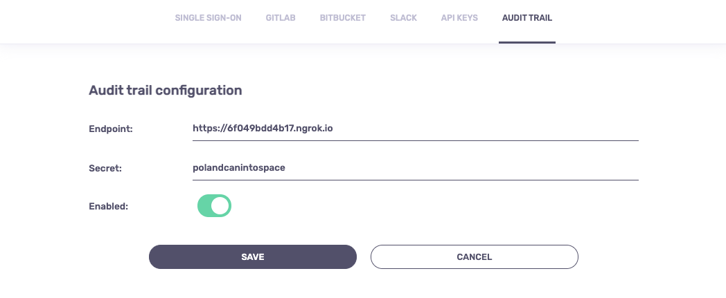 You will then need to provide a webhook endpoint and an arbitrary secret that you can later use for verifying payload. Let's use ngrok for the purpose of this tutorial: