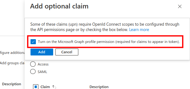 Click the Add button, making sure to enable the Turn on the Microsoft Graph profile permission checkbox on the popup that appears: