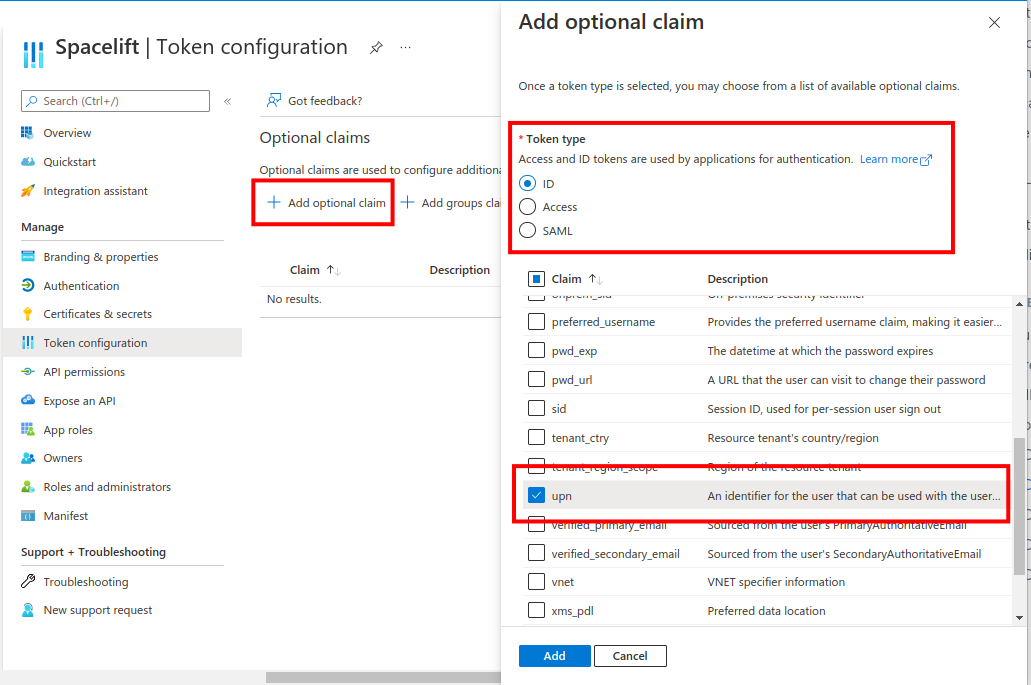 Click the Add optional claim button, choose the ID token type, and select the upn claim: