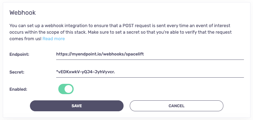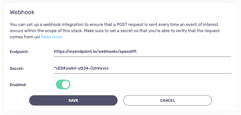 You will be presented with a simple setup form that requires you to provide and endpoint to which the payload is sent, and an optional secret that you can use to validate that the incoming requests are indeed coming from Spacelift: