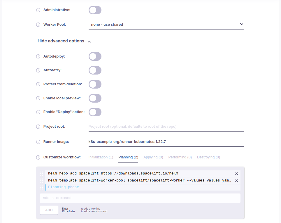 • You need to use a custom Spacelift worker image that has Helm installed, or alternatively you can install Helm using a before init hook.