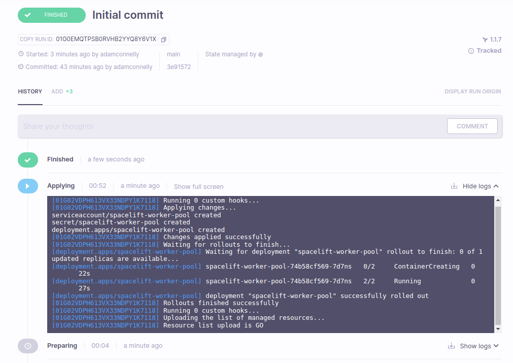 After approving the run, you should see the changes applying, along with a successful rollout of your Chart resources:
