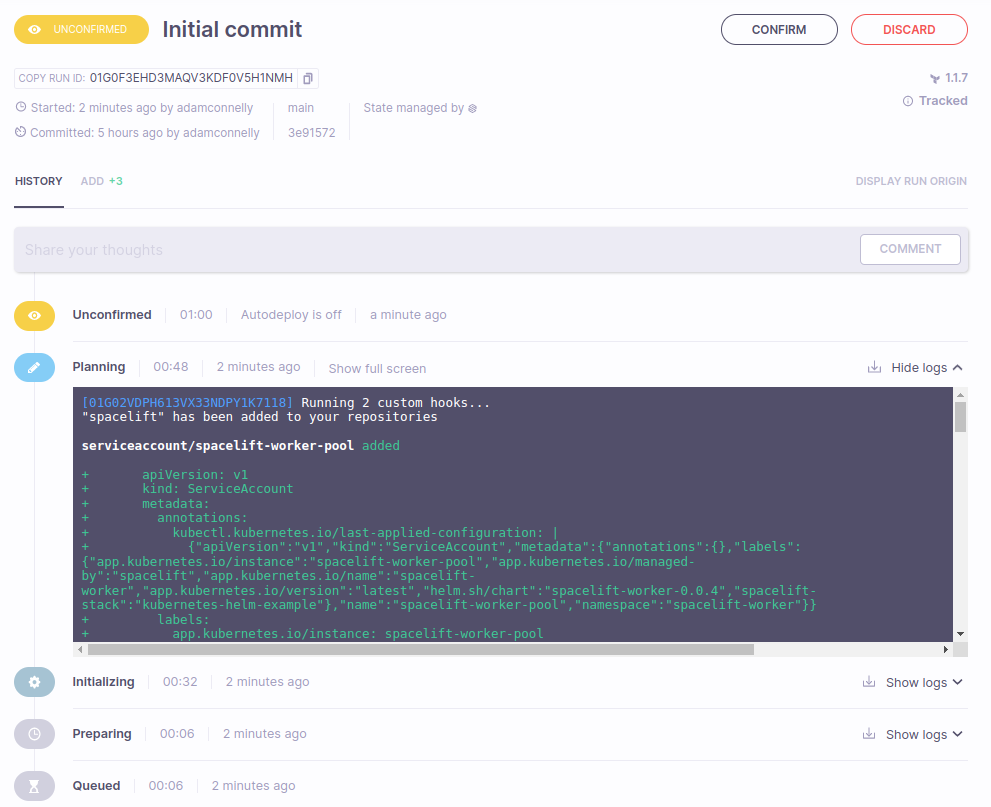 Triggering runs works exactly the same as when not using Helm. Once the planning stage has completed, you should see a preview of your changes, showing the Chart resources that will be created: