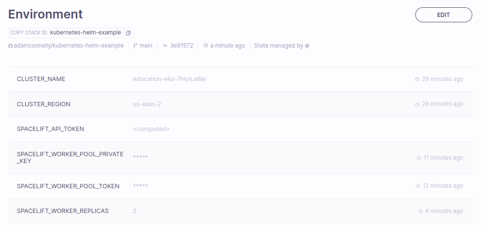 The rest of this page will go through an example of deploying the Spacelift Workerpool Helm Chart using the Kubernetes integration. See here for an example repository.