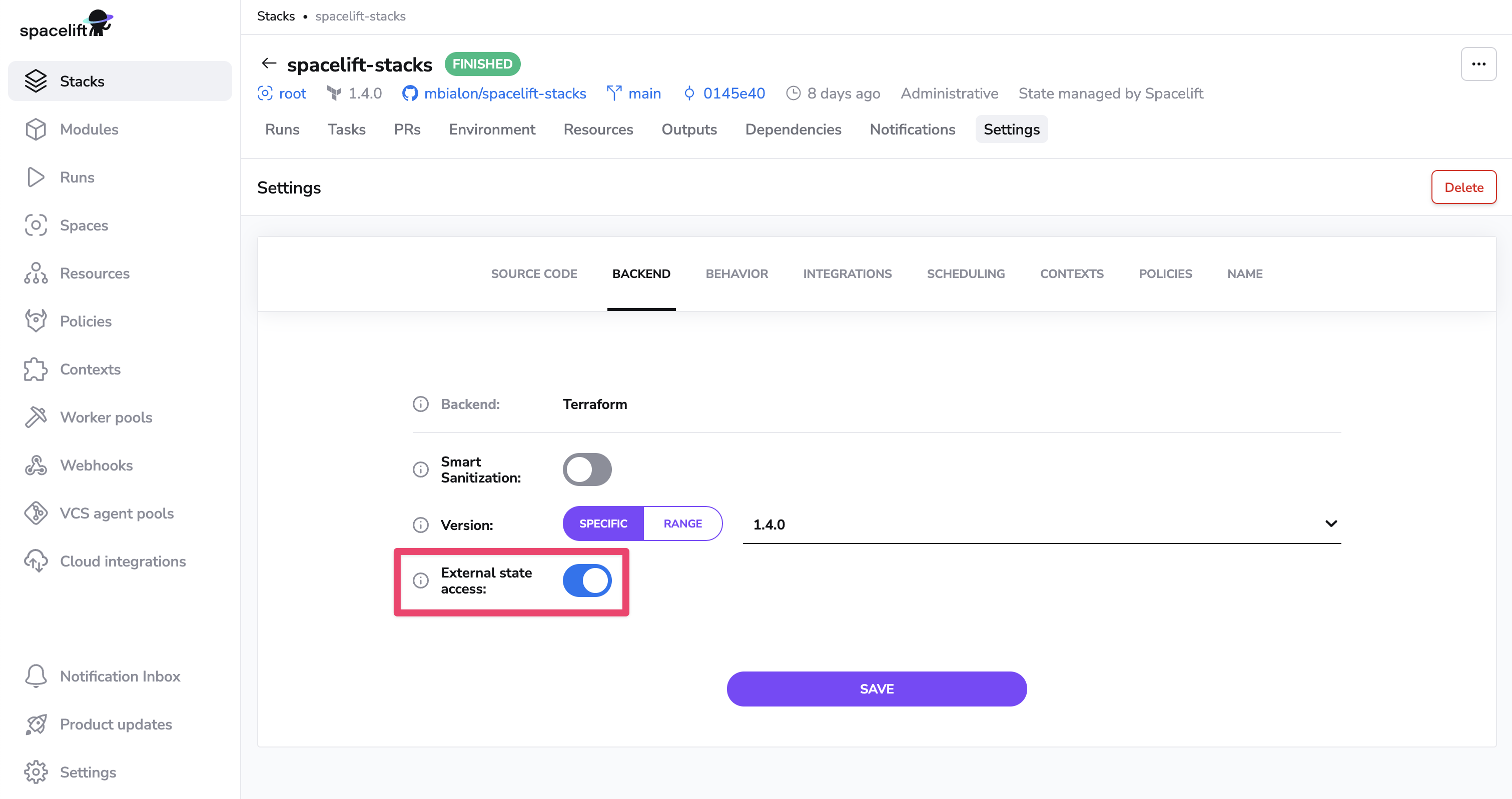 External state access allows you to read the state of the stack from outside authorized runs and tasks. In particular, this enables sharing the outputs between stacks using the Terraform mechanism of remote state or even accessing the state offline for analytical or compliance purposes.