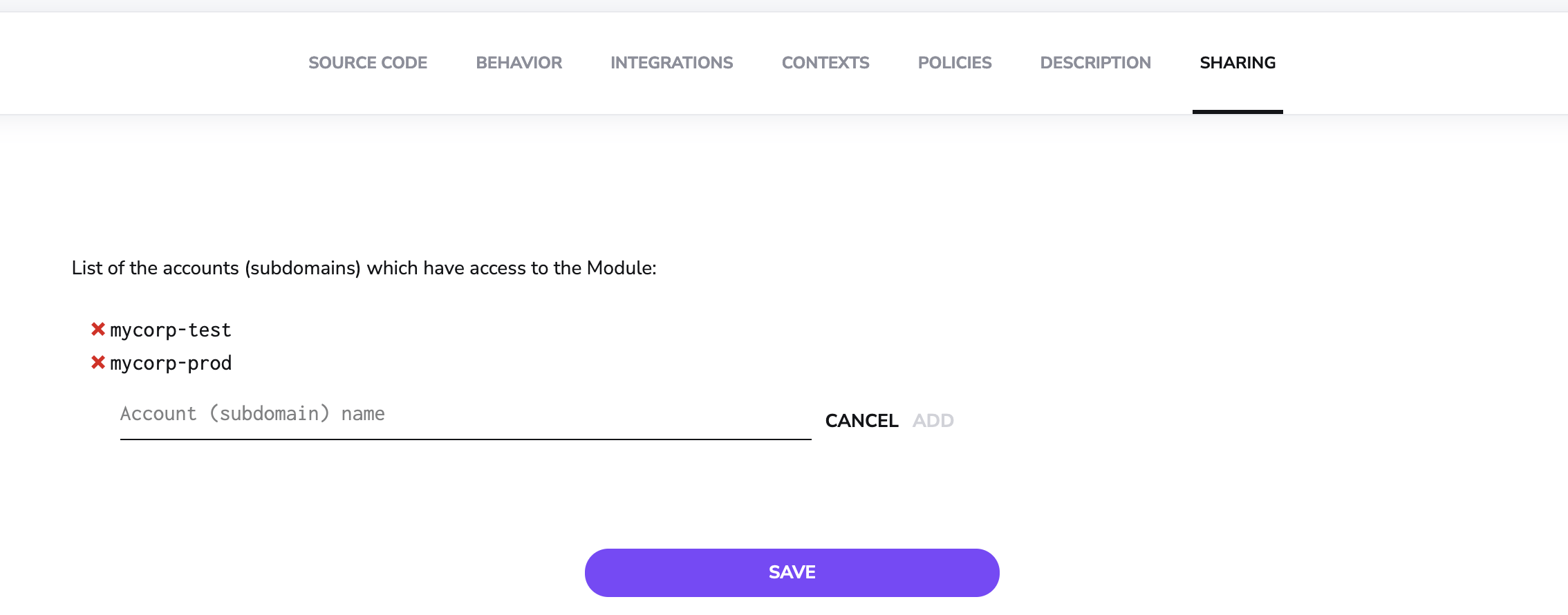 In order to share the module with other accounts, please add their names in subdomain form (all lowercase) in the module settings Sharing section: