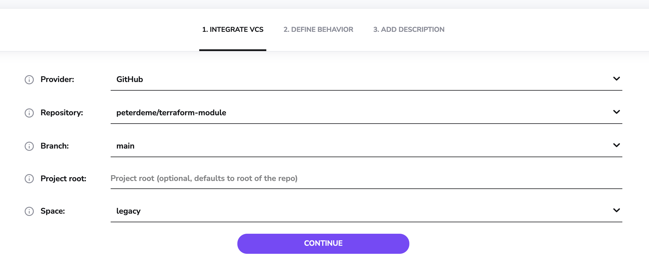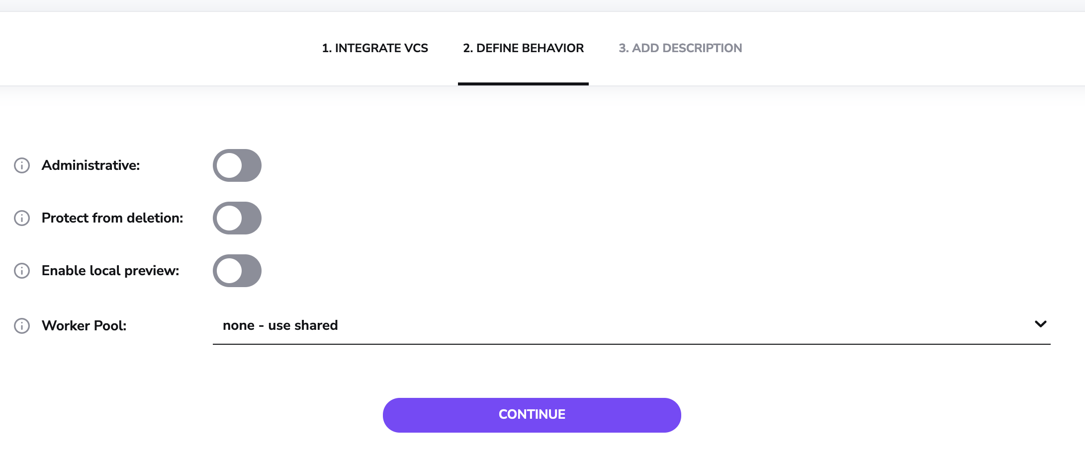 In the behavior section there are just three settings: administrative, worker pool and project root. You will only need to set administrative to true if your module manages Spacelift resources (and most likely it does not). Setting worker pool to the one you manage yourself makes sense if the module tests will be touching resources or accounts you don't want Spacelift to access directly. Plus, your private workers may have more bandwidth than the shared ones, so you may get feedback faster. The project root let's you specify the module source code root inside of your repository: