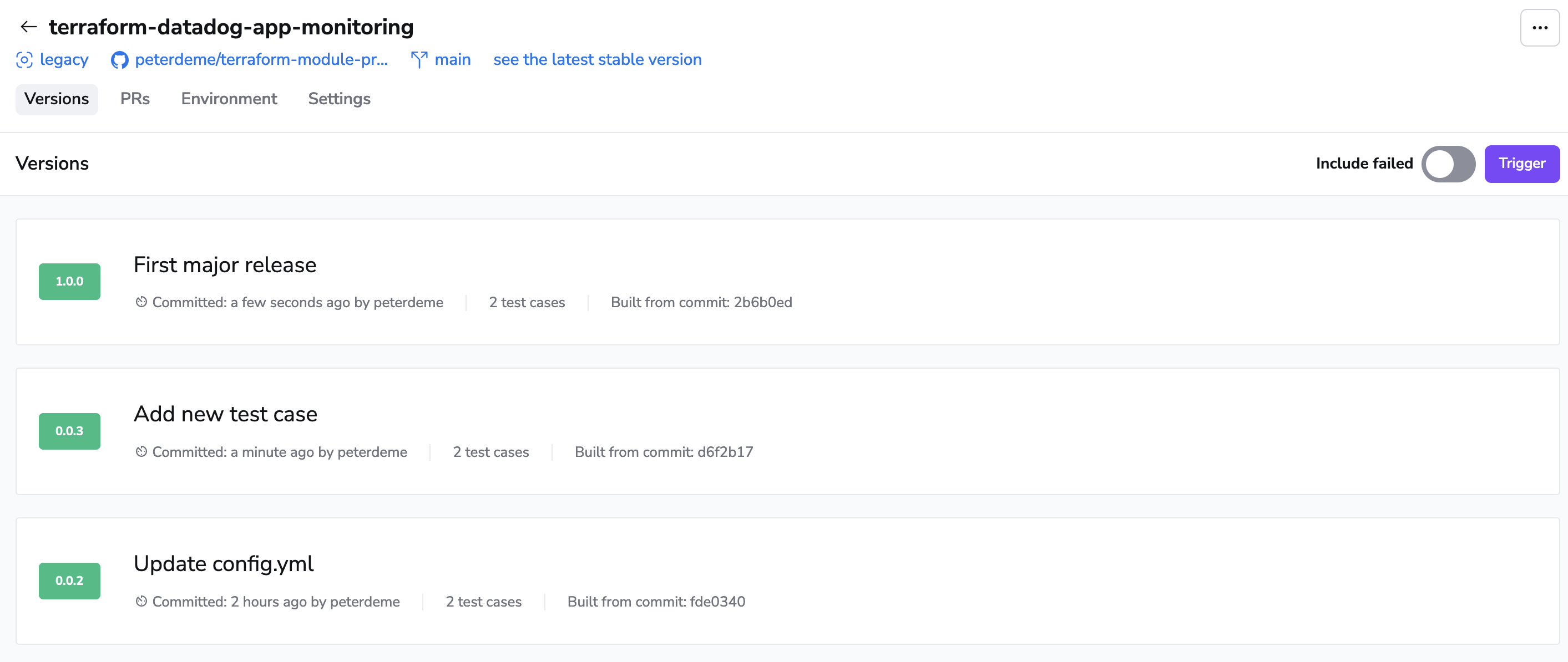 Whenever tests succeed on a tracked change, a new Version is created based on the module_version in the configuration. Important thing to note is that Spacelift will not let you reuse the number of a successful version, and will require you to strictly follow semantic versioning - ie. you can't go to from 0.2.0 to 0.4.0, skipping 0.3.0 entirely.