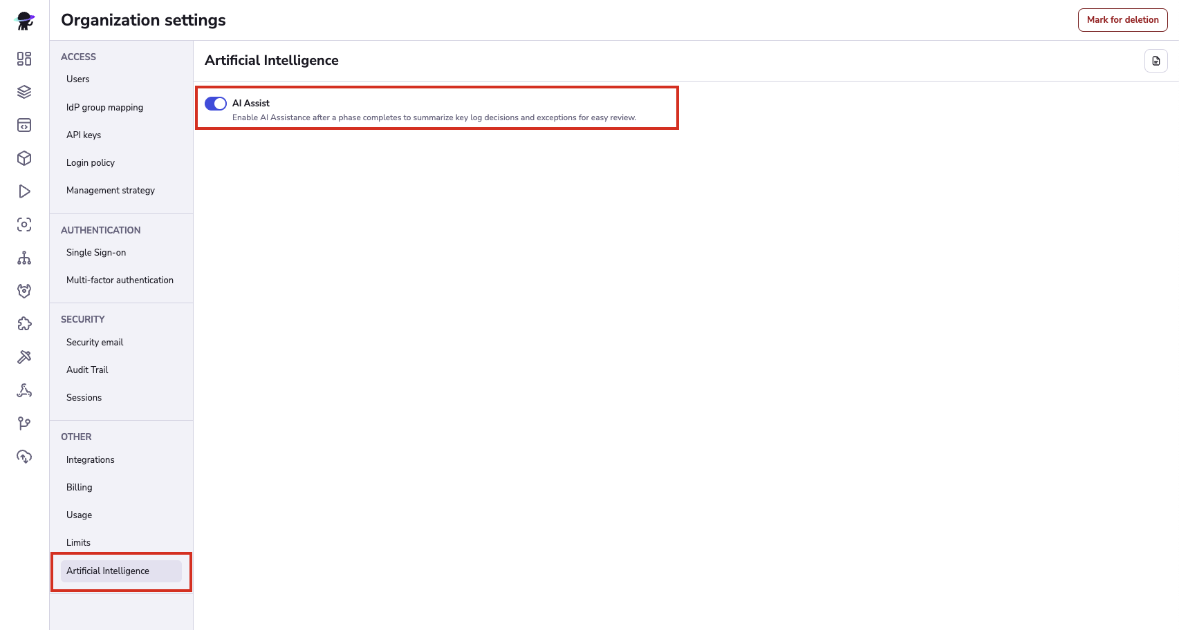 AI features have to be enabled by an admin user. Admins can locate the AI settings screen in Organization settings > Artificial Intelligence. When enabling the AI assist features for the first time, you'll be asked to accept the Terms and Conditions. Once accepted, all the users with write access to runs will be able to ask for assistance on failed runs.