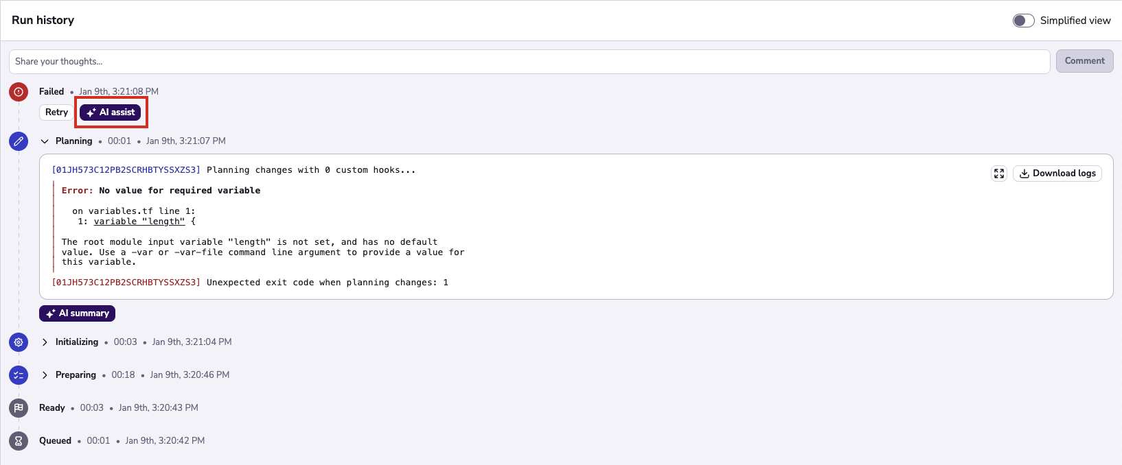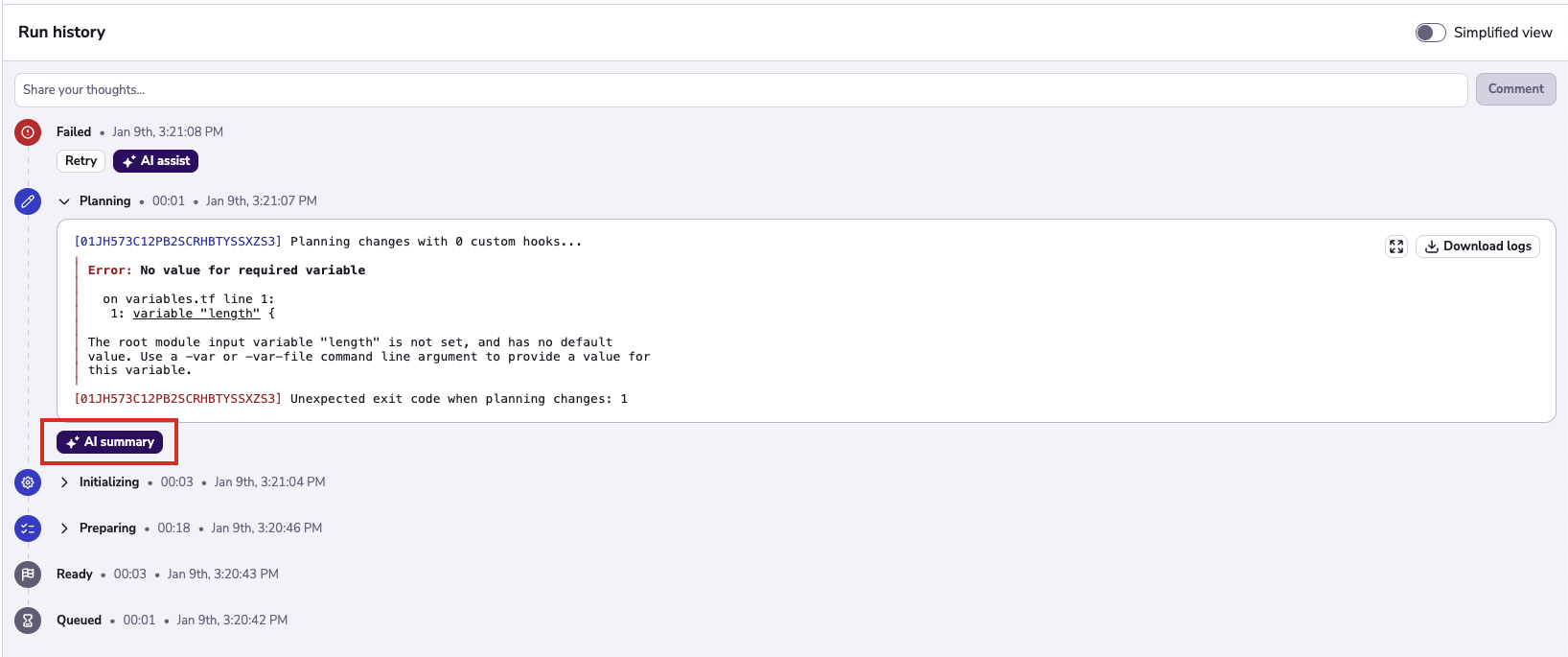 - You can also execute a Run based summary. This summary uses the logs of the "Initialize", "Plan" and "Apply" phases combined and is ideal for catching issues that span across multiple stages. This summary is slower to run, but it is very helpful when dealing with more complex issues.
