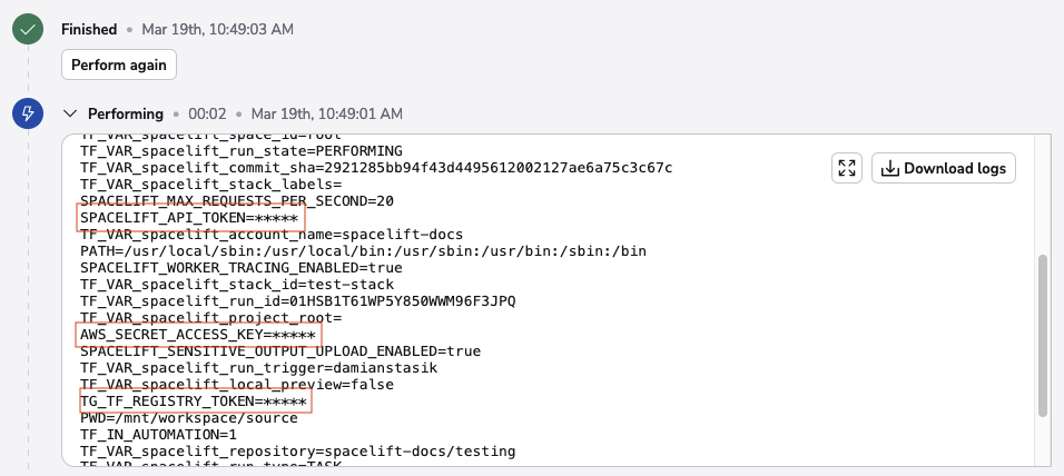 Spacelift's integration with infra providers like AWS also allows authentication without any credentials whatsoever, which further protects you from the shame and humiliation of having the keys to the kingdom leaked by running the occasional env command, as you do. Actually, let's run it in Spacelift to see what gives: