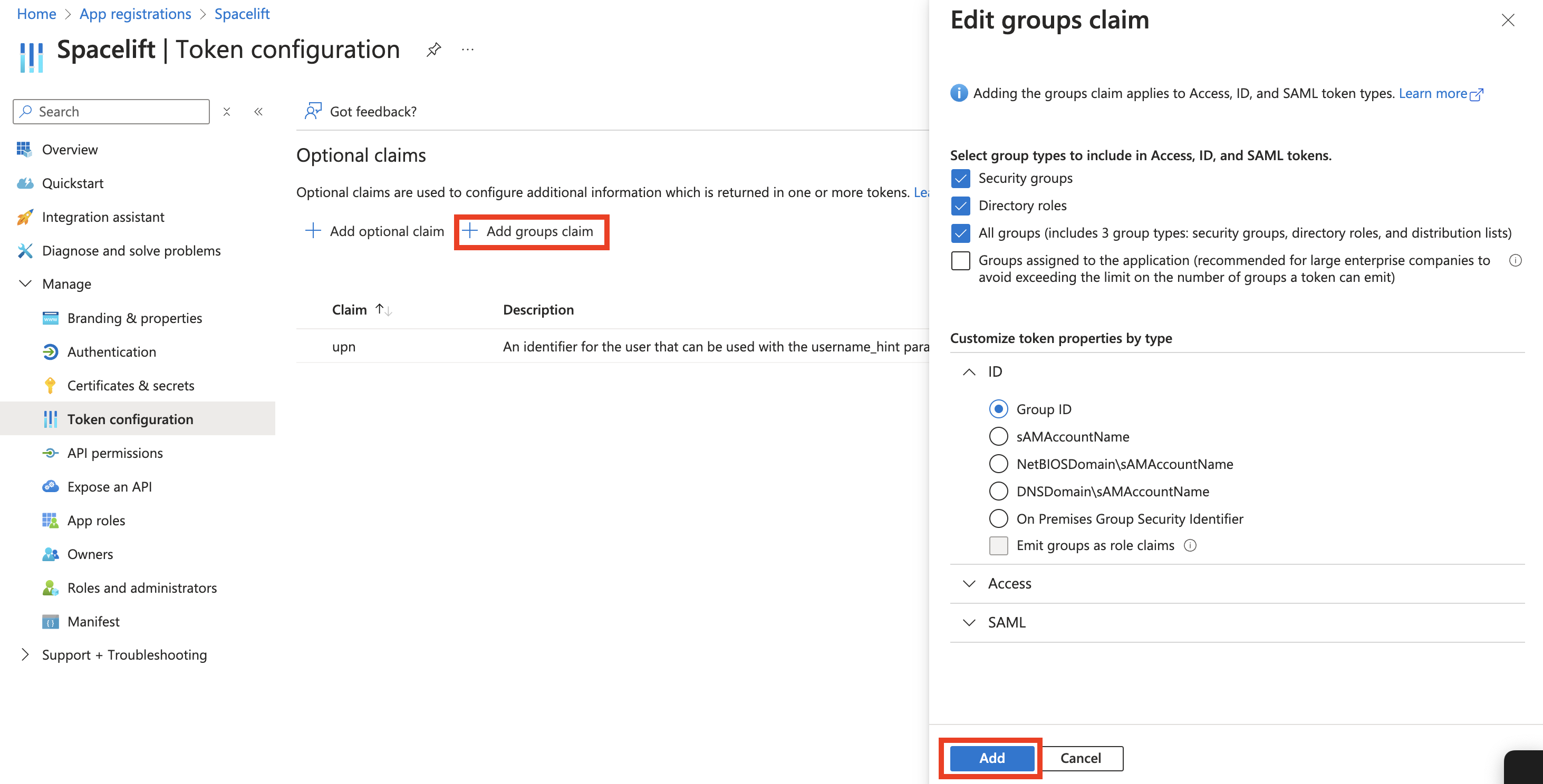 To include group information, you can optionally add the "groups" claim. Please select the options that meet your needs and then click the "Add" button.