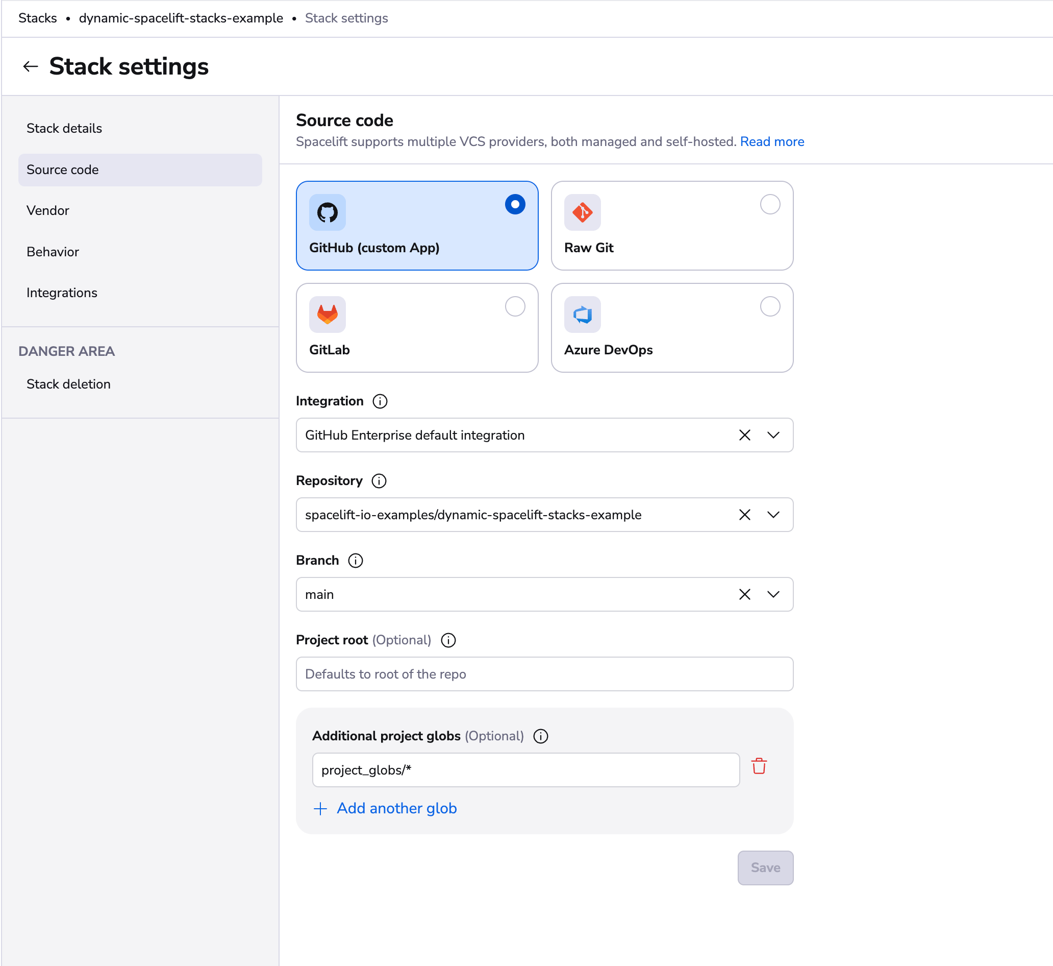 Repository and branch point to the location of the source code for a stack. The repository must either belong to the GitHub account linked to Spacelift (its choice may further be limited by the way the Spacelift GitHub app has been installed) or to the GitLab server integrated with your Spacelift account. For more information about these integrations, please refer to our GitHub and GitLab documentation respectively.