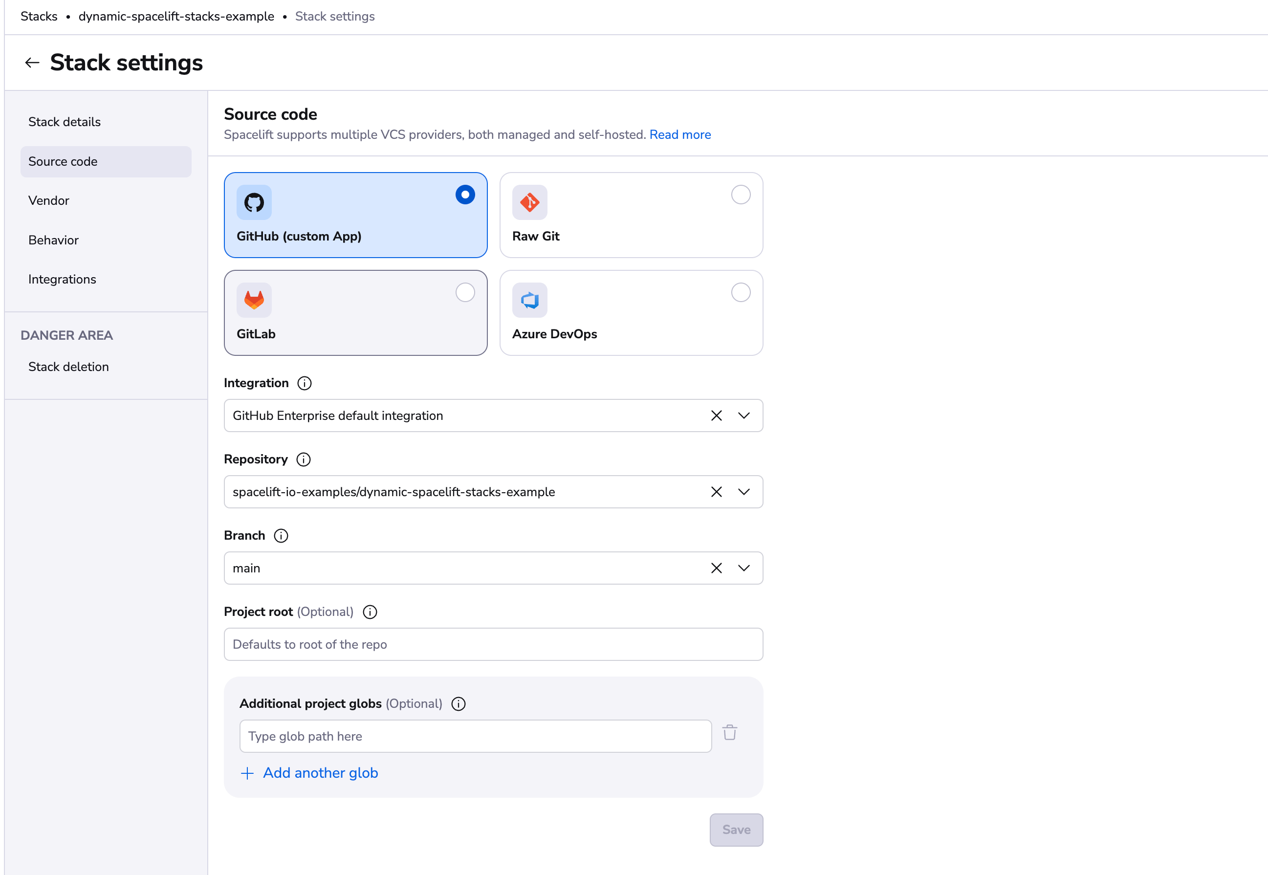 Moving a repository between GitHub and GitLab or the other way around is simple, however. Just change the provider setting on the Spacelift project, and point the stack to the new source code location.